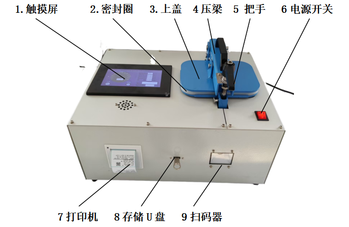 仪器由控制系统、主机、显示器、封压装置、打印机、扫码器、存储U盘及管路系统等部件构成。