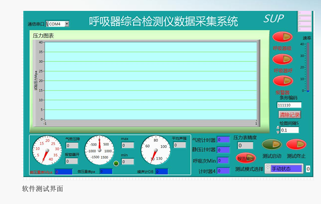 由电动机、波纹管和控制电路组成。波纹管的顶部有一个开口与试验头模的嘴相通,从计算机来的指令控制电动机运转。电动机通过连杆压缩或拉伸波纹管,从试验头模的嘴中吸入和呼出空气。人工肺有一个外壳,外壳前面板上有一个电源指示灯和一个电源开关,用于接通机内电源。外壳后面板有一个电源接口用于接入220V电源。有一个数据输入/输出接口用于人工肺与计算机之间的数据传输,有一个传感器接口,用于将人工肺内的微压传感器和高压传感器取得的数据传送给计算机。在外壳的左侧有一个高压接口,用于通过高压总管将气瓶的压力接入高压传感器。