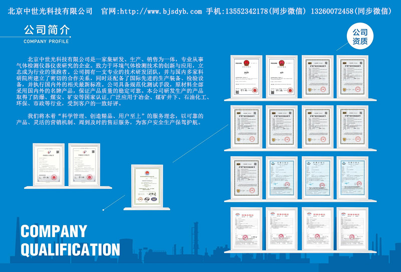 北京中世光科技有限公司是一家集研发、生产、销售为一体,专业从事气体检测仪器仪表研究的企业。致力于环境气体检测技术的创新与应用,立志成为行业的领跑者。公司拥有一支专业的技术研发团队,并与国内多家科研院所建立了密切的合作关系,同时还配备了因际先进的生产装备、检验设备,并执行国内外的相关最新标准,公司具备规范化测试手段,原材料全部采用国内外的名牌产品,保证产品质量的稳定可靠。本公司研发生产的产品取得了防燥、煤安、矿安等国家认证,广泛应用于冶金、煤矿井下、石油化工环保、市政等行业,受到客户的一致好评。