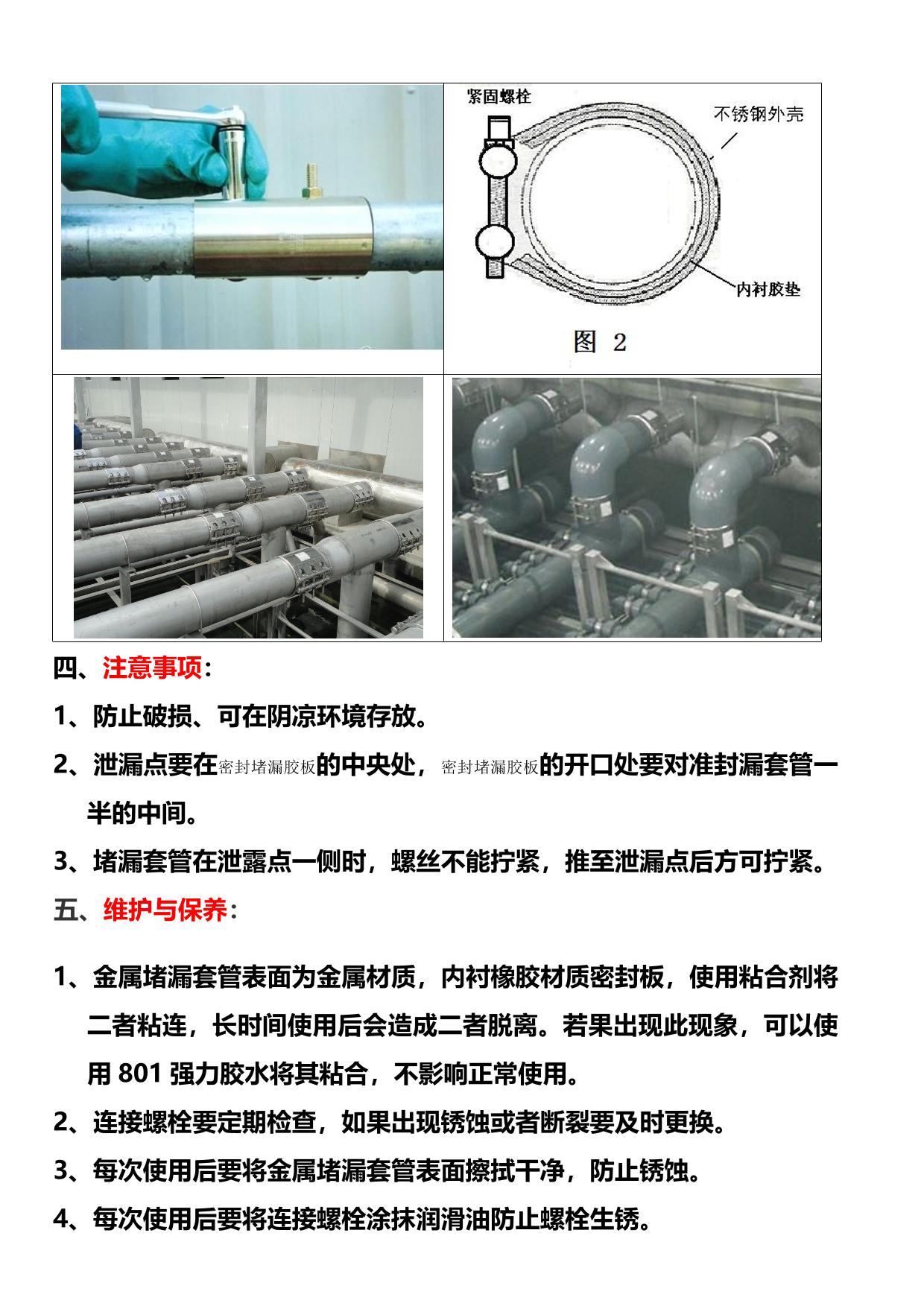 不锈钢金属堵漏套管是抢险救援的必备专用堵漏器材,具有管径适应范围广、堵漏面积大、安装快捷方便、可重复使用、密封性能优良、耐震动等特点。
