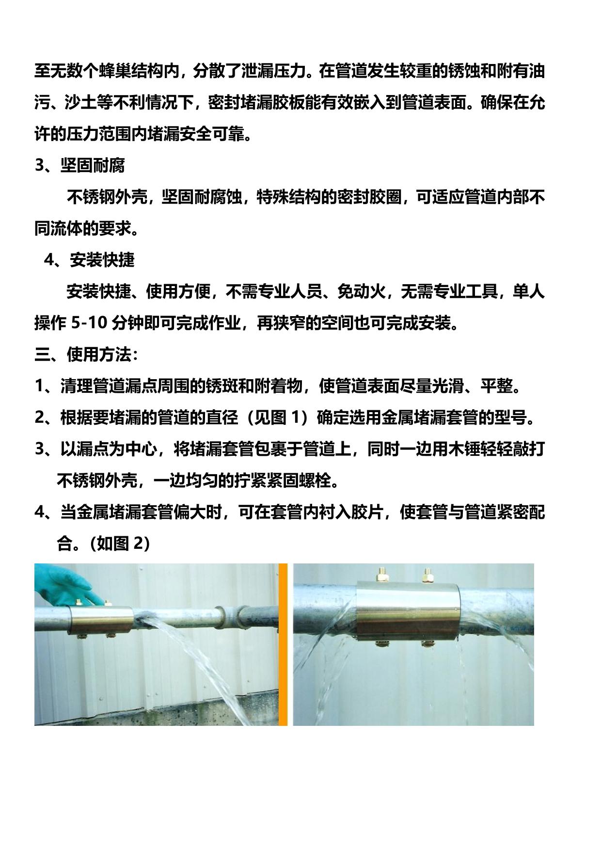 本产品是由不锈钢外套与内衬特殊结构的密封橡胶圈复合而成。用于管道的带压快速堵漏。堵漏时将管卡包裹在漏点处,由螺栓卡紧,也可代替法兰、焊接等方法用于新管道的连接。可大幅度降低工程费用,节约资源,保护环境。是该领域一项最新的技术与工艺。