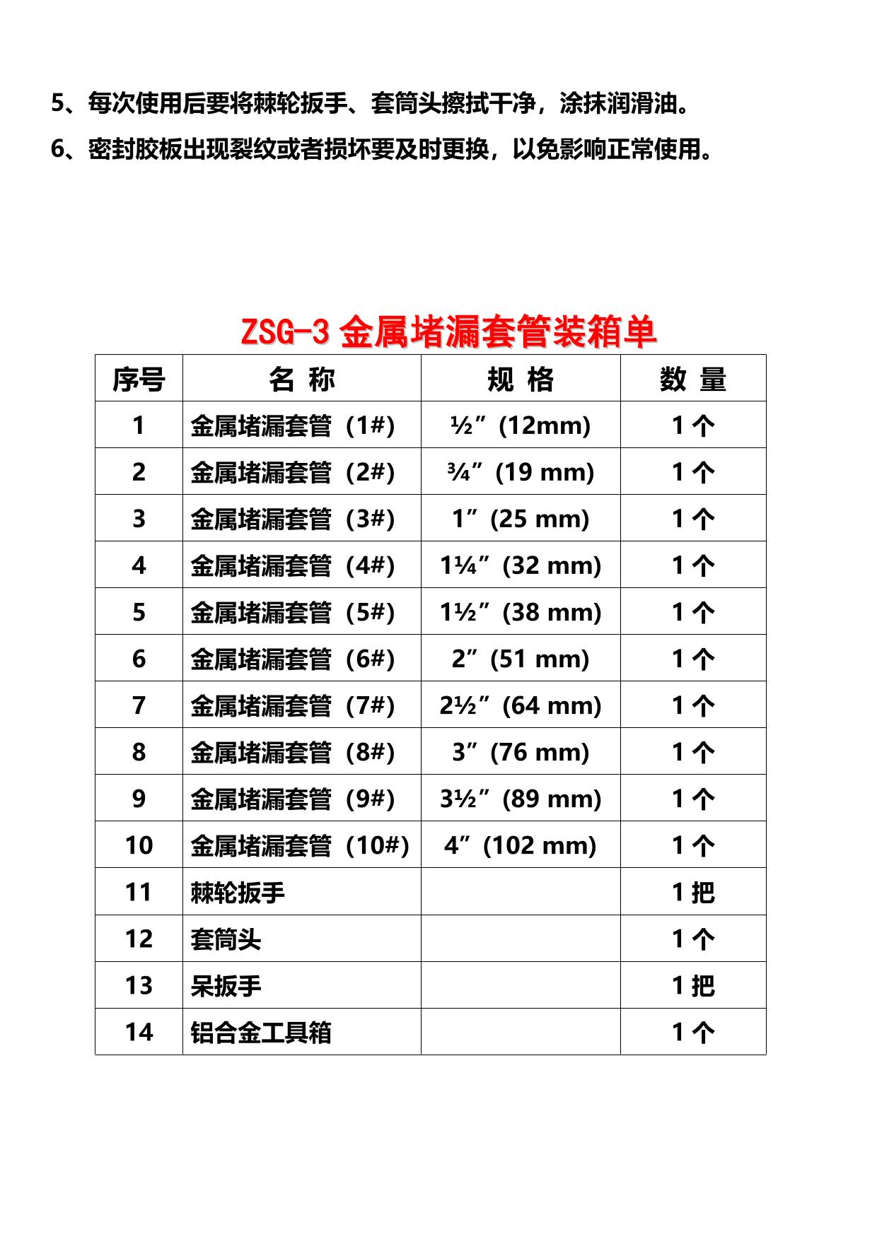 产品简介:金属堵漏套管防爆金属堵漏套管是北京中世光科技有限公司的主营产品!金属堵漏套管结构简单、堵漏方便,它是消防部队和其它应急救 援部门处置管道泄漏事故的重要工具。本产品由十种规格的金属 堵漏套、胶垫和专业扳手等工具组成。